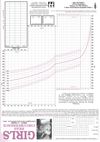 Head circumference centiles are printed only up to 1 year (PCHR and Community Charts and 5 years (4-in-1 charts) but, in a significant cumber of cases, children’s head circumference may need to be assessed even later in their childhood. These charts cover all the childhood years and have a facility to record parental head sizes. You should be pleased to note that the charts are designed so that versions for each gender need not be individually ordered: the girls and boys head circumference centiles are printed back-to-back on a single card.