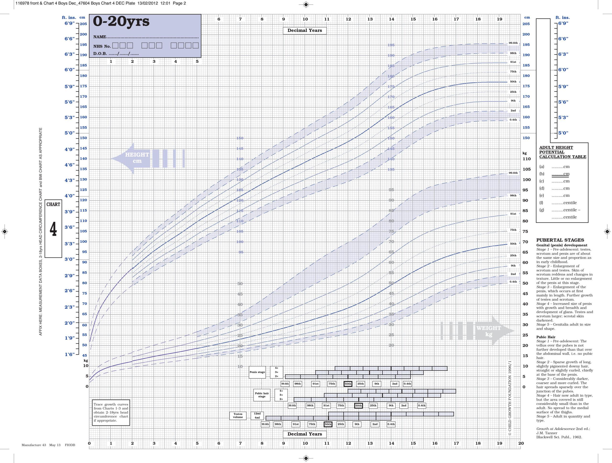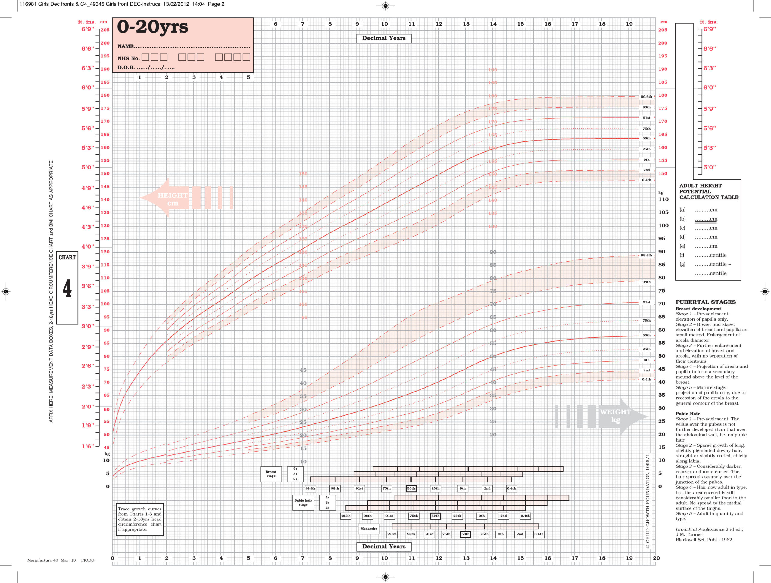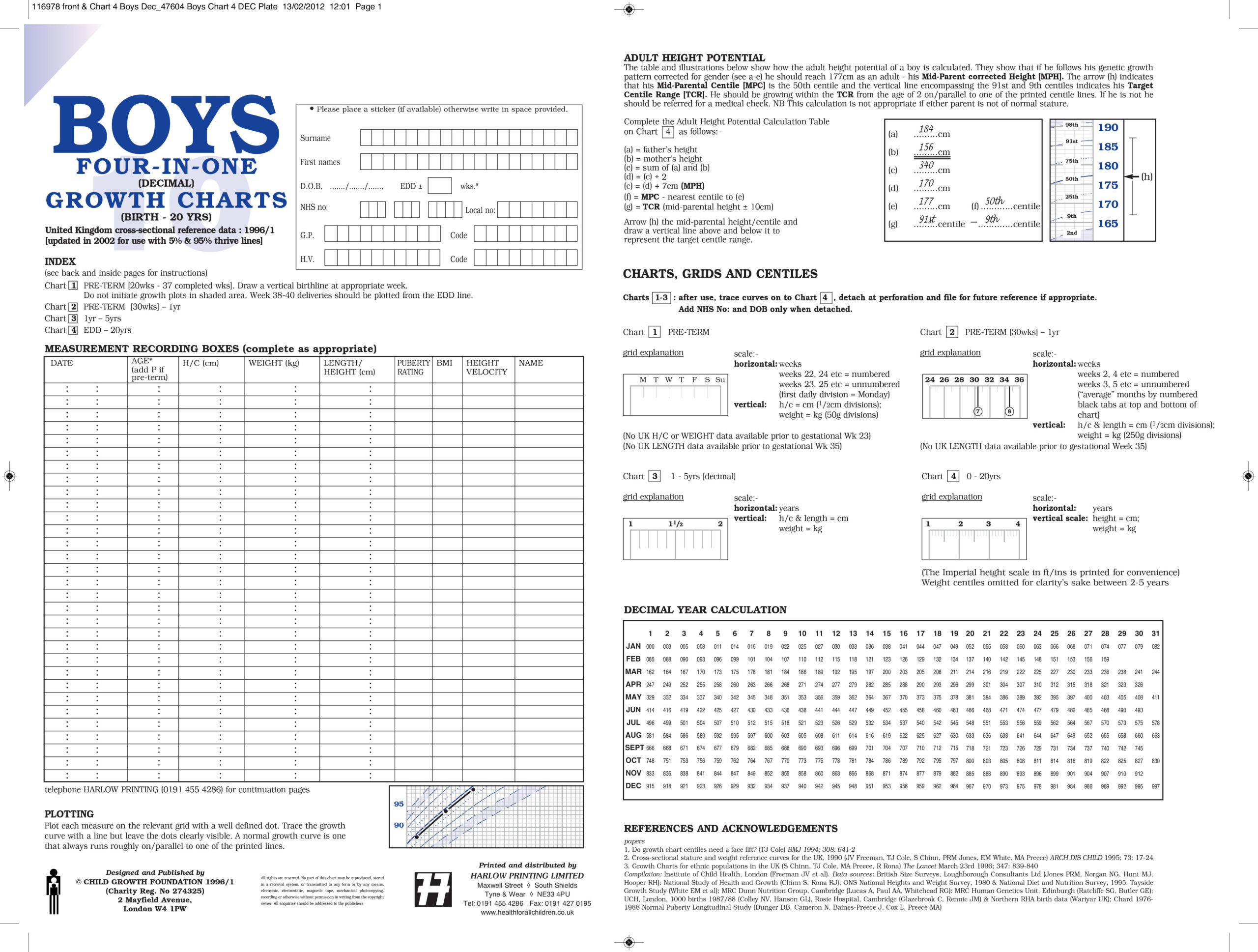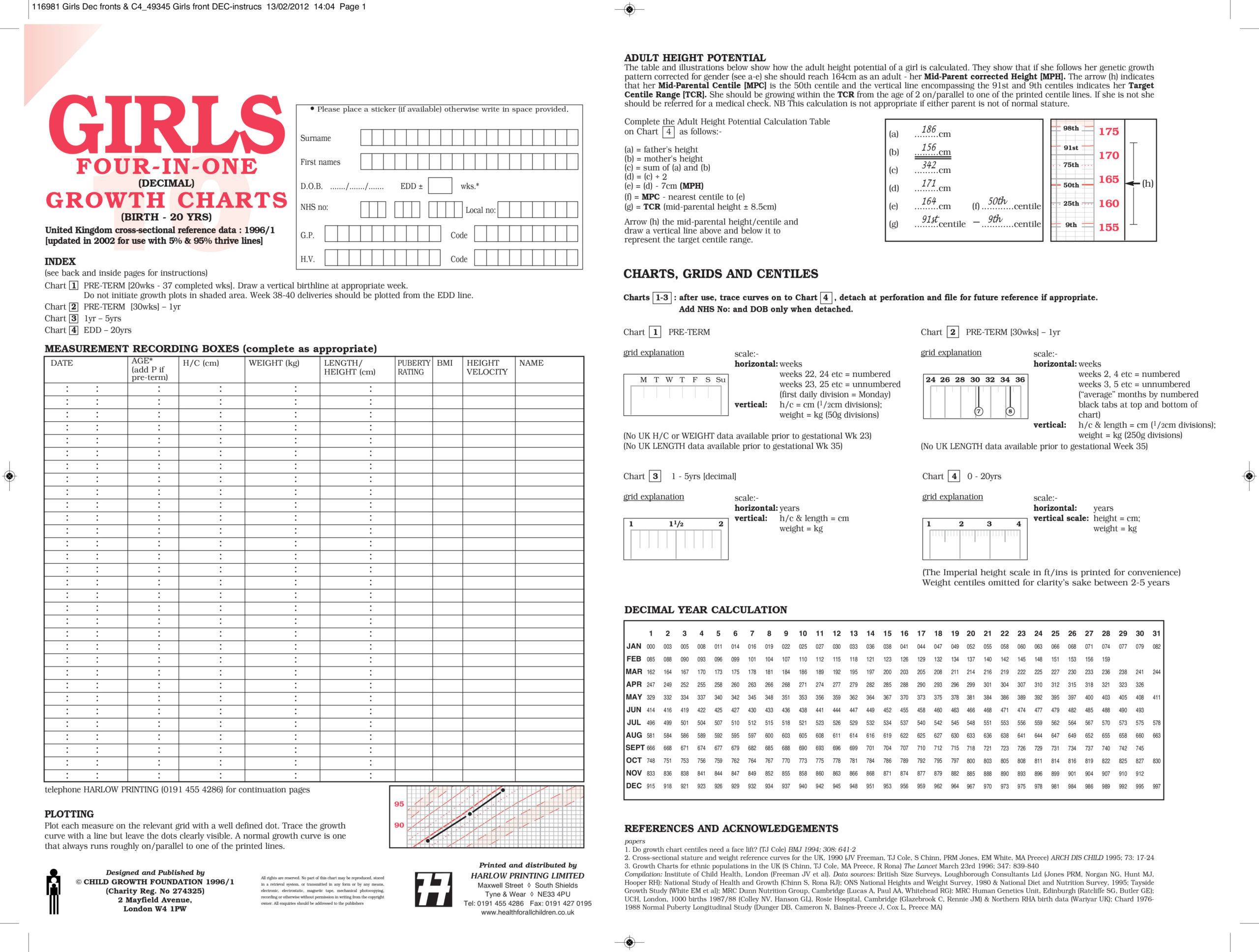 The 4-in-1 charts are the clinical records designed principally for hospital use where detailed charts for pre-term babies and their follow-up are likely to be in demand. They are also designed in decimal and duodecimal years for use by paediatric endocrinologists and general paediatricians respectively. Three of the four charts cover the period from 2 weeks – 5 years, the fourth chart illustrating the ‘panorama’ of growth from birth – 20 years. The panorama also features boys and girls pubertal stages. The charts are marketed in packs for boys and girls respectively.